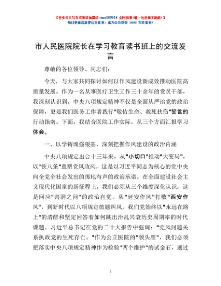 / 市人民医院院长在学习教育读书班上的交流发言