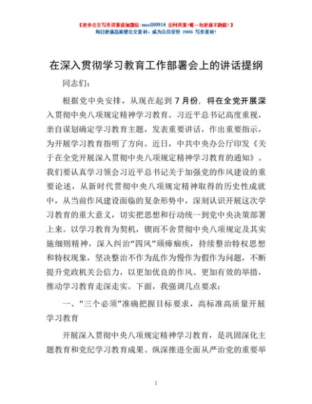 / 在深入贯彻学习教育工作部署会上的讲话提纲
