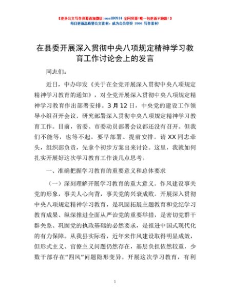 / 在县委开展深入贯彻中央八项规定精神学习教育工作讨论会上的发言