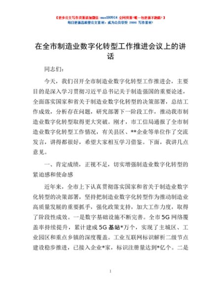 / 在全市制造业数字化转型工作推进会议上的讲话