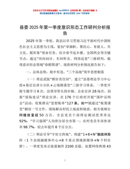/ 县委2025年第一季度意识形态工作研判分析报告