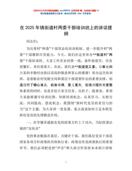 / 在2025年镇街道村两委干部培训班上的讲话提纲
