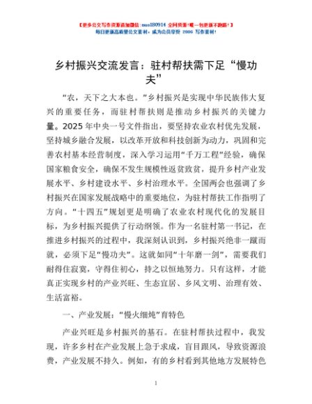 / 乡村振兴交流发言:驻村帮扶需下足“慢功夫”