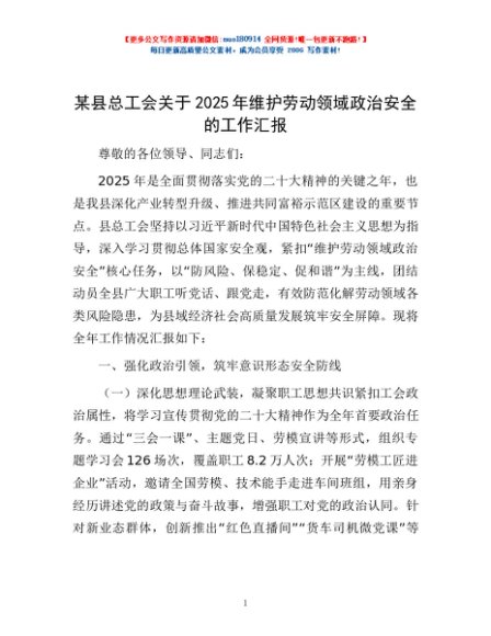/ 某县总工会关于2025年维护劳动领域政治安全的工作汇报