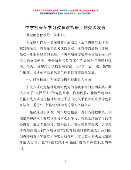 / 中学校长在学习教育读书班上的交流发言