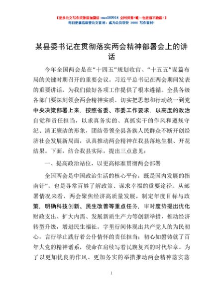 / 某县委书记在贯彻落实两会精神部署会上的讲话