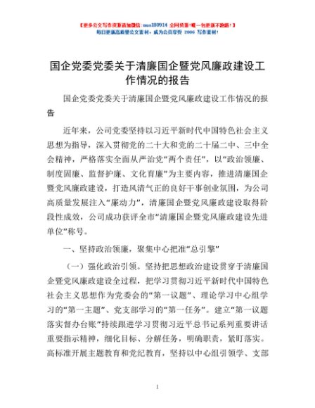 / 国企党委党委关于清廉国企暨党风廉政建设工作情况的报告