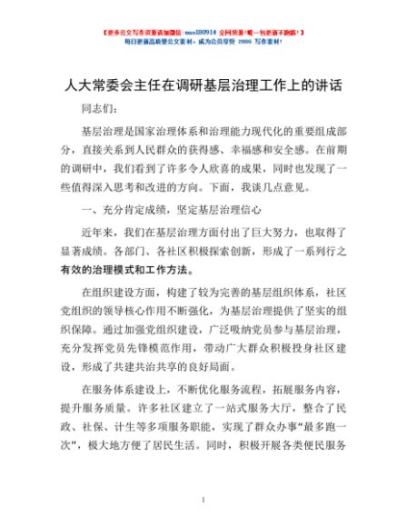 / 人大常委会主任在调研基层治理工作上的讲话