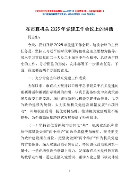 / 在市直机关2025年党建工作会议上的讲话