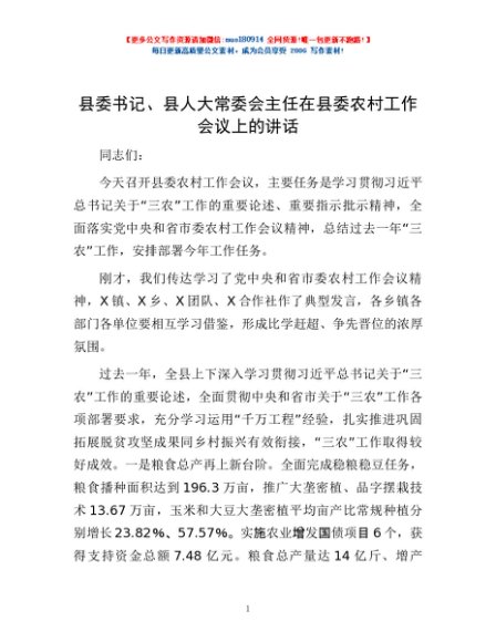 / 县委书记、县人大常委会主任在县委农村工作会议上的讲话