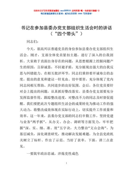 / 书记在参加县委办党支部组织生活会时的讲话(“四个带头”)