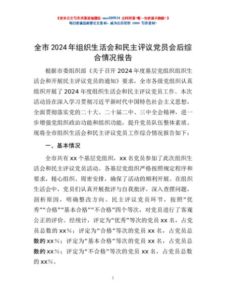 / 全市2024年组织生活会和民主评议党员会后综合情况报告