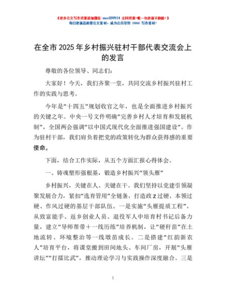 / 在全市2025年乡村振兴驻村干部代表交流会上的发言
