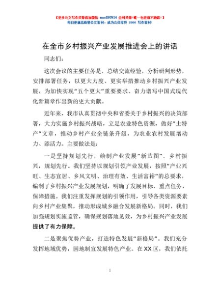 / 在全市乡村振兴产业发展推进会上的讲话