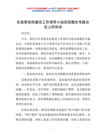 / 在县委党的建设工作领导小组巡视整改专题会议上的讲话