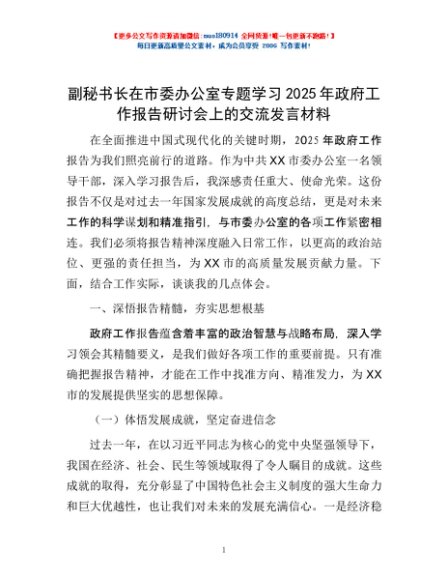 / 副秘书长在市委办公室专题学习2025年政府工作报告研讨会上的交流发言材料