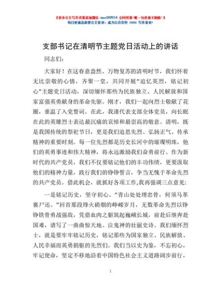 / 支部书记在清明节主题党日活动上的讲话