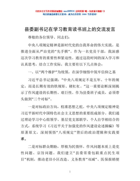 / 县委副书记在学习教育读书班上的交流发言