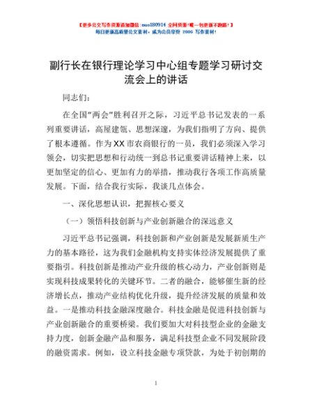 / 副行长在银行理论学习中心组专题学习研讨交流会上的讲话