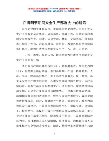 / 在清明节期间安全生产部署会上的讲话