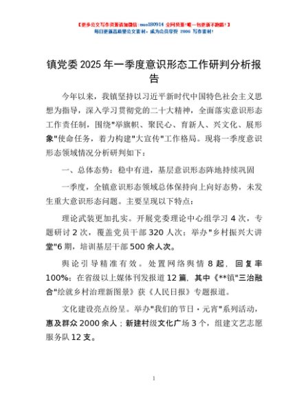 / 镇党委2025年一季度意识形态工作研判分析报告