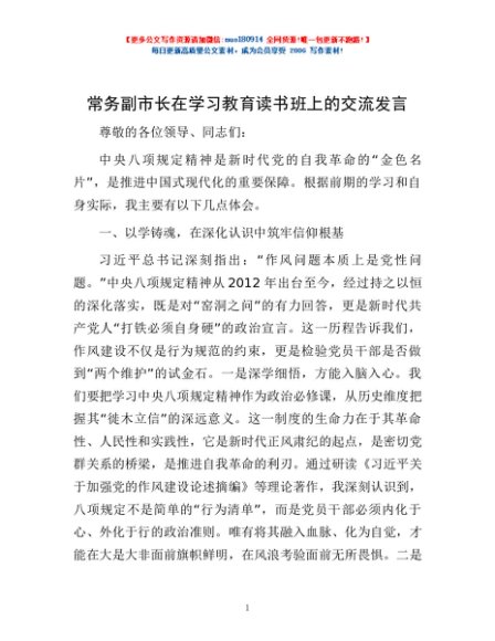 / 常务副市长在学习教育读书班上的交流发言
