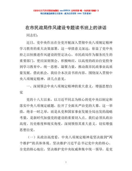 / 在市民政局作风建设专题读书班上的讲话