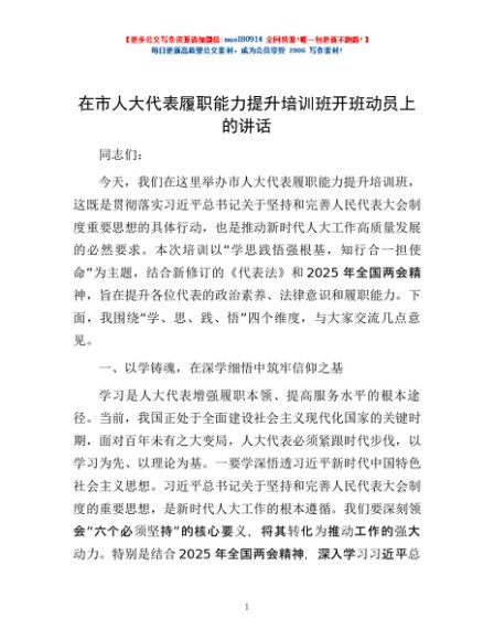 / 在市人大代表履职能力提升培训班开班动员上的讲话