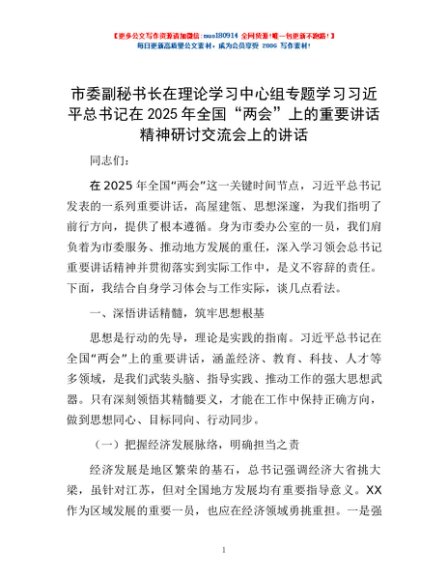 / 市委副秘书长在理论学习中心组专题学习习近平总书记在2025年全国“两会”上的重要讲话精神研讨交流会上的讲话