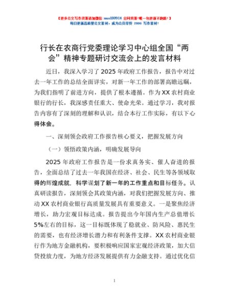 / 行长在农商行党委理论学习中心组全国“两会”精神专题研讨交流会上的发言材料