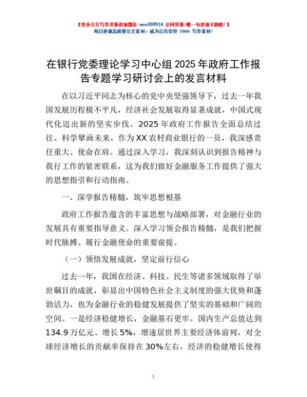 / 在银行党委理论学习中心组2025年政府工作报告专题学习研讨会上的发言材料
