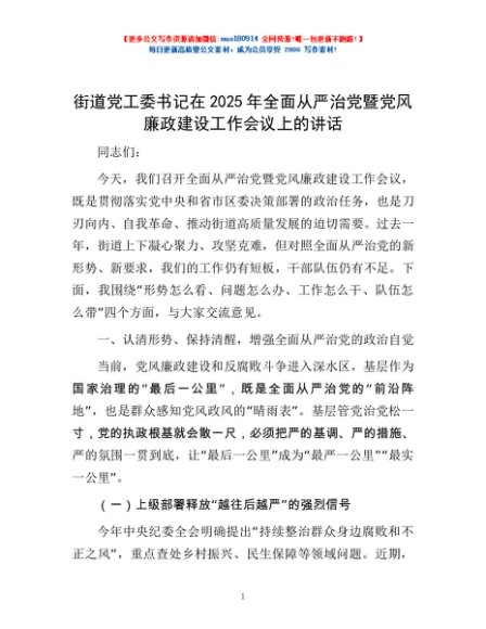 / 街道党工委书记在2025年全面从严治党暨党风廉政建设工作会议上的讲话