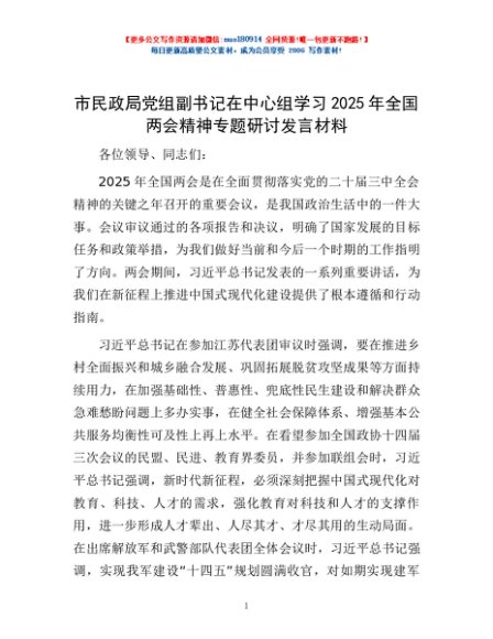 / 市民政局党组副书记在中心组学习2025年全国两会精神专题研讨发言材料