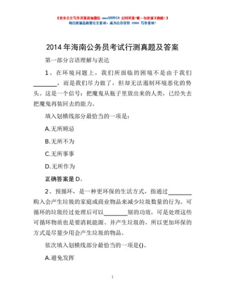 2014年海南公务员考试行测真题及答案