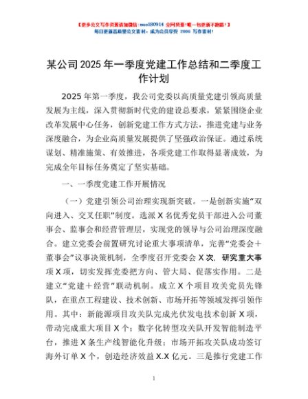 / 某公司2025年一季度党建工作总结和二季度工作计划