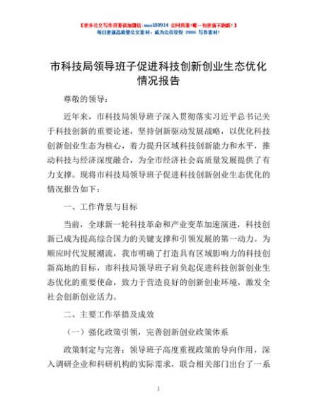 / 市科技局领导班子促进科技创新创业生态优化情况报告