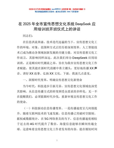/ 在2025年全市宣传思想文化系统DeepSeek应用培训班开班仪式上的讲话