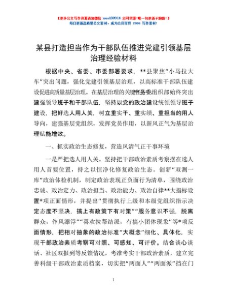 / 某县打造担当作为干部队伍推进党建引领基层治理经验材料