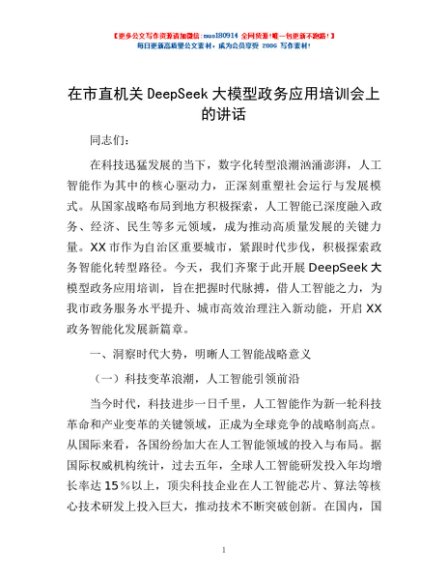 / 在市直机关DeepSeek大模型政务应用培训会上的讲话