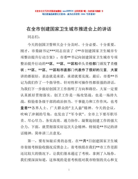 / 在全市创建国家卫生城市推进会上的讲话