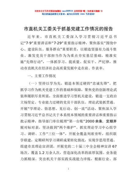/ 市直机关工委关于抓基党建工作情况的报告