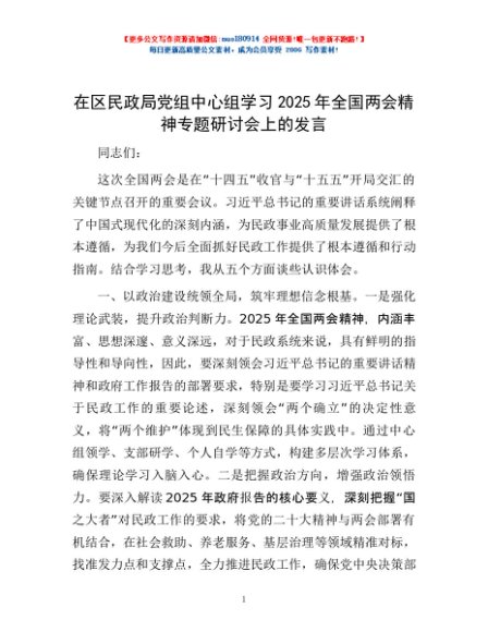 / 在区民政局党组中心组学习2025年全国两会精神专题研讨会上的发言