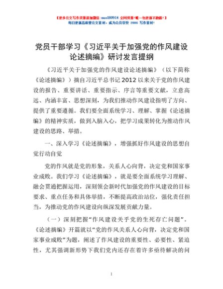 / 党员干部学习《习近平关于加强党的作风建设论述摘编》研讨发言提纲