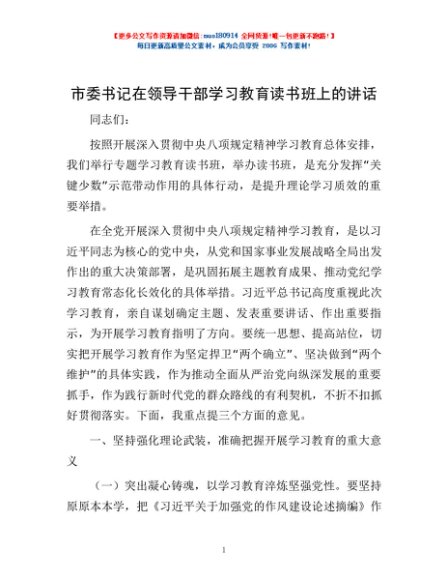 / 市委书记在领导干部学习教育读书班上的讲话