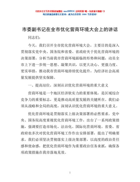 / 市委副书记在全市优化营商环境大会上的讲话