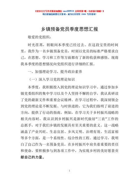 / 乡镇预备党员季度思想汇报