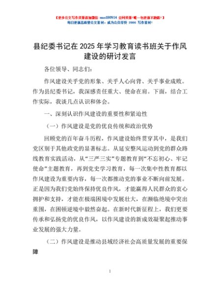 / 县纪委书记在2025年学习教育读书班关于作风建设的研讨发言