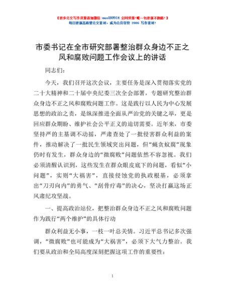 / 市委书记在全市研究部署整治群众身边不正之风和腐败问题工作会议上的讲话