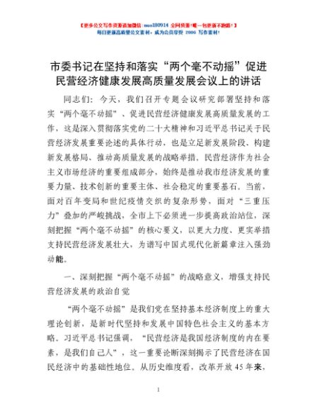 / 市委书记在坚持和落实“两个毫不动摇” 促进民营经济健康发展高质量发展会议上的讲话