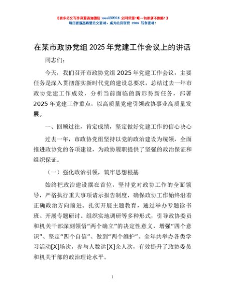 / 在某市政协党组2025年党建工作会议上的讲话